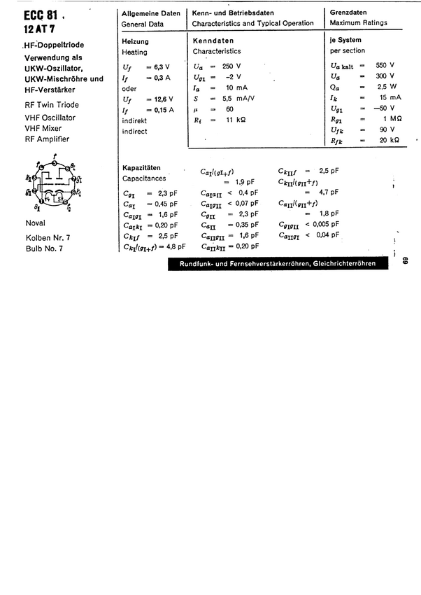 Lampa elektronowa ECC ECC 81 = 12 AT 7 BTB Vertrieb ECC 81 = 12 AT 7 Ilość styków 9 Trzonek Noval Opis: Podwójna trioda