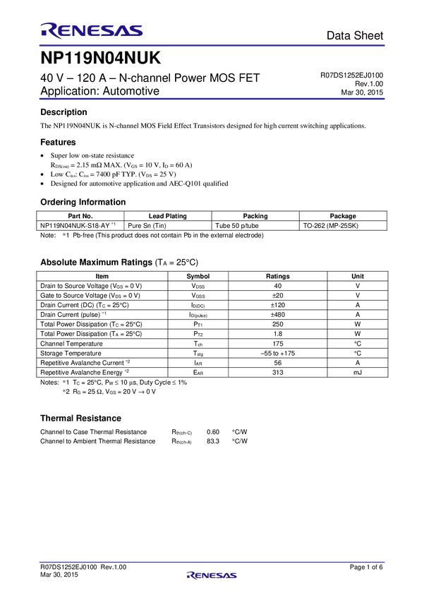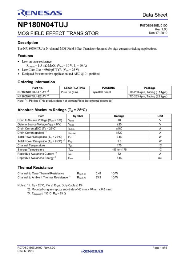 Nch Power MOSFET 40V 180A 1.25mohm TO-263-7 / D2PAK-7 for Automotive