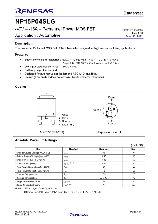 Pch Power MOSFET -40V -15A 40mohm TO-252 / DPAK for Automotive