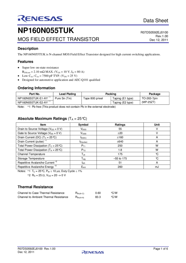 Nch Power MOSFET 55V 180A 1.75mohm TO-263-7 / D2PAK-7 for Automotive