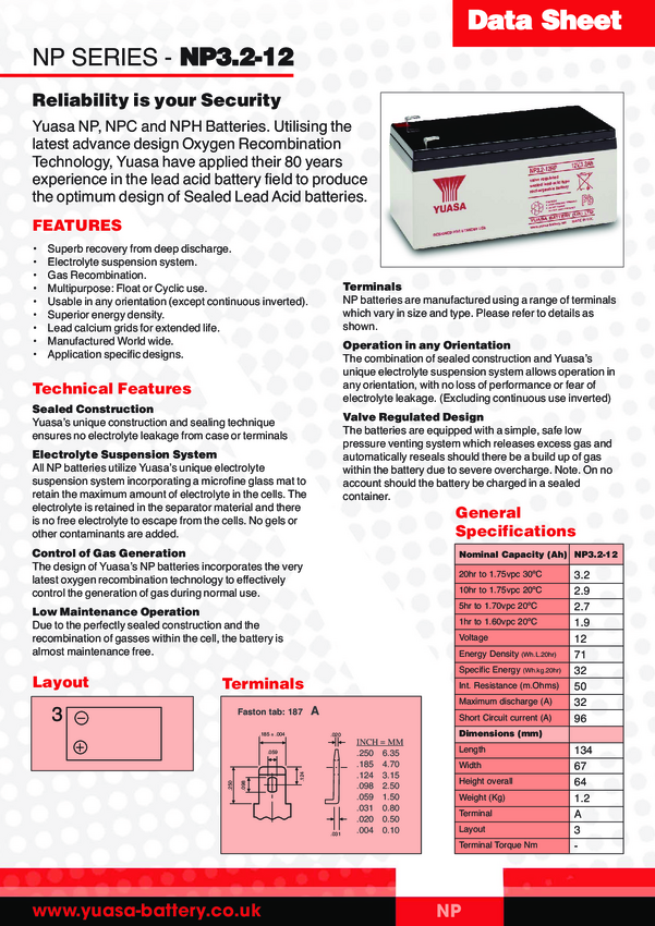 Yuasa NP3.2-12 NP3.2-12 Akumulator ołowiowy 12 V 3.2 Ah AGM (S x W x G) 134 x 64 x 67 mm płaska wtyczka 4,8 mm bezobsług
