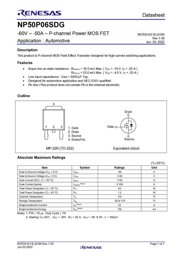 Pch Power MOSFET -60V -50A 16.5mohm TO-252 / DPAK for Automotive