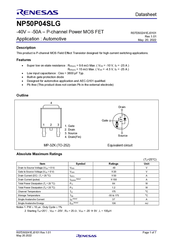 Pch Power MOSFET -40V -50A 9.6mohm TO-252 / DPAK for Automotive