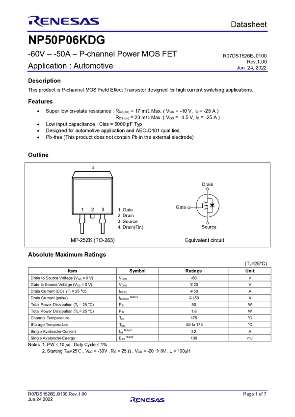 Pch Power MOSFET -60V -50A 17mohm TO-263 / D2PAK for Automotive