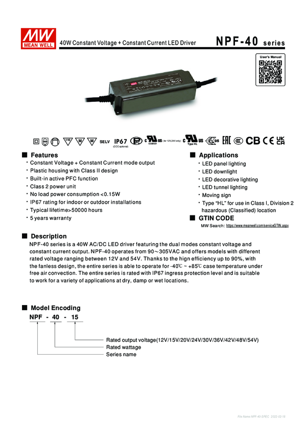MEAN WELL NPF-40-15 Sterownik LED, Transformator LED Stałonapięciowy, Stałonaprądowy 40 W 2.67 A 9 - 15 V/DC nie nadaje