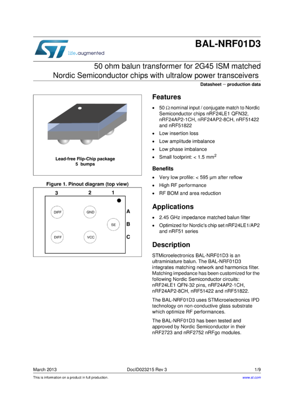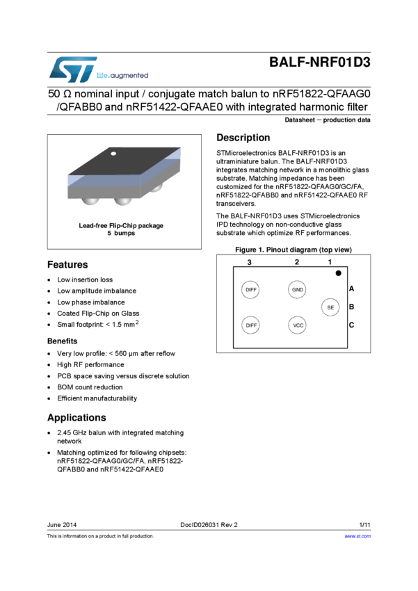 50Ω nominal input / conjugate match balun to nRF24LE1 & nRF51822-QFAA, with integrated harmonic filter