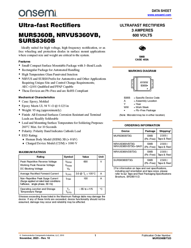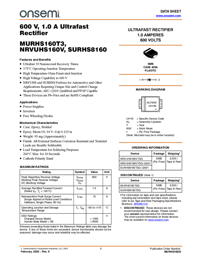 Power Rectifier, Ultra-Fast Recovery, 1 A, 600 V