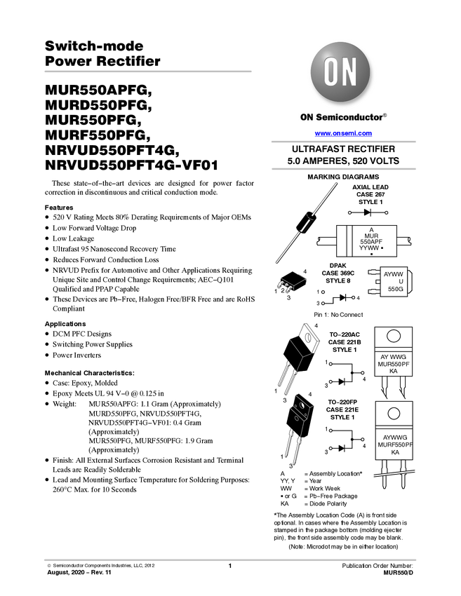 Power Rectifier, Switch-mode, Ultrafast, 5.0 A, 520 V, for Power Factor Correction