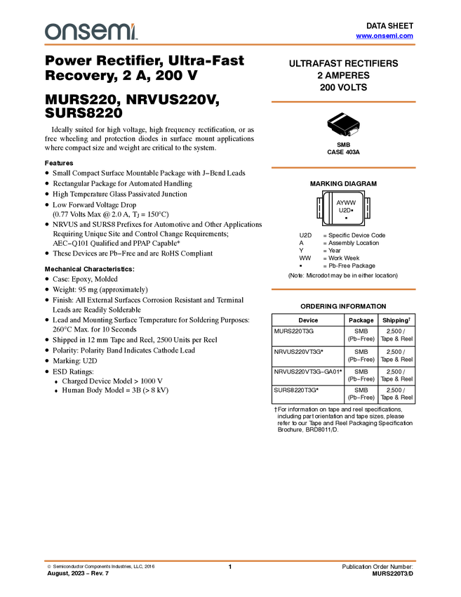 Power Rectifier, Ultra-Fast Recovery, 2 A, 200 V