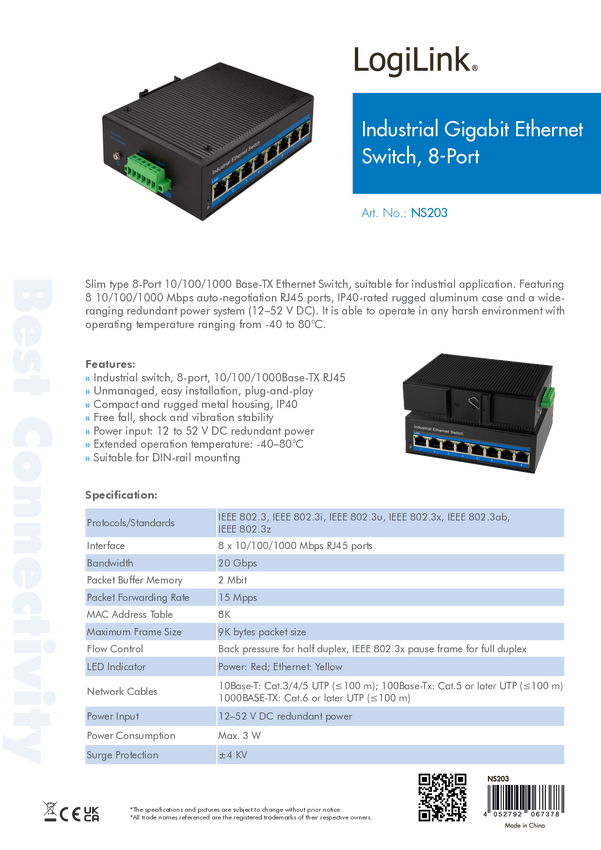 Przemysłowy przełącznik Gigabit Ethernet, 8 portów, 10/100/1000 Mbit/s