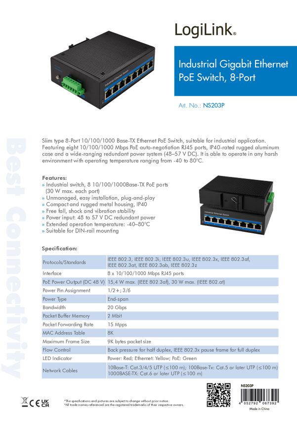 Przemysłowy switch Gibabit Ethernet PoE, 8 portów, 10/100/1000 Mbit/s