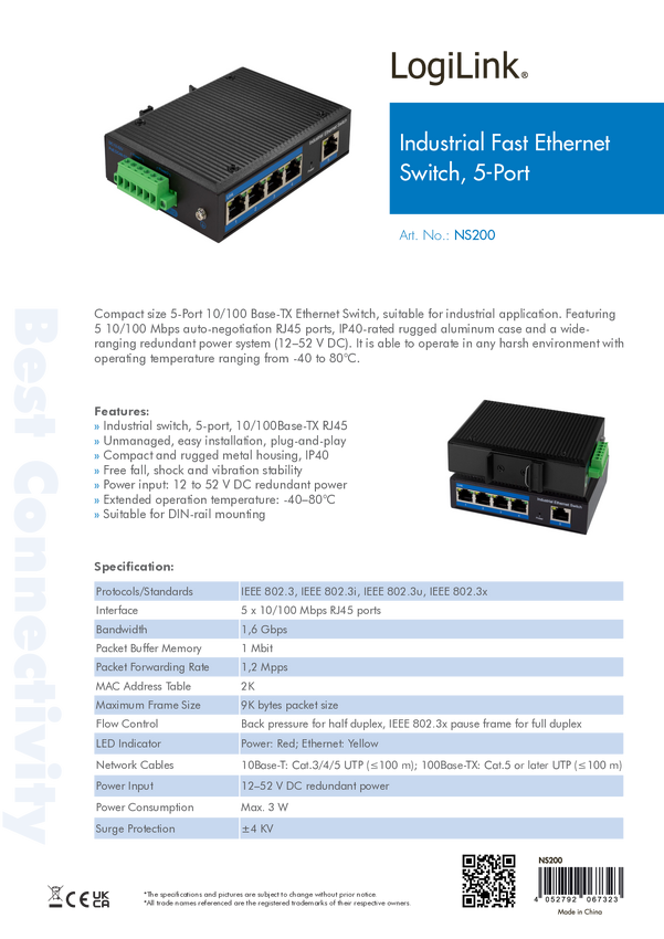Przemysłowy przełącznik Fast Ethernet, 5 portów, 10/100 Mbit/s