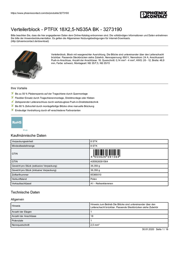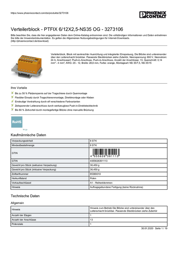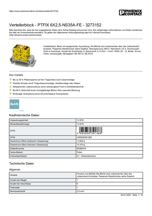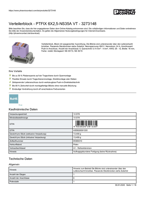 Blok rozdzielający Phoenix Contact PTFIX 6X2,5-NS35A VT 3273148, 10 szt.