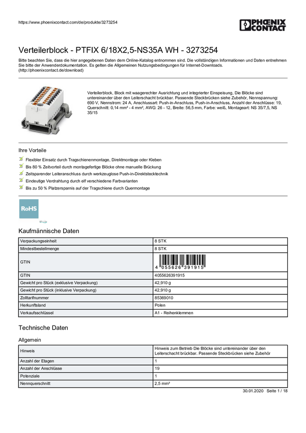 Blok rozdzielający Phoenix Contact PTFIX 6/18X2,5-NS35A WH 3273254, 8 szt.