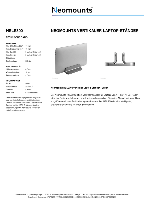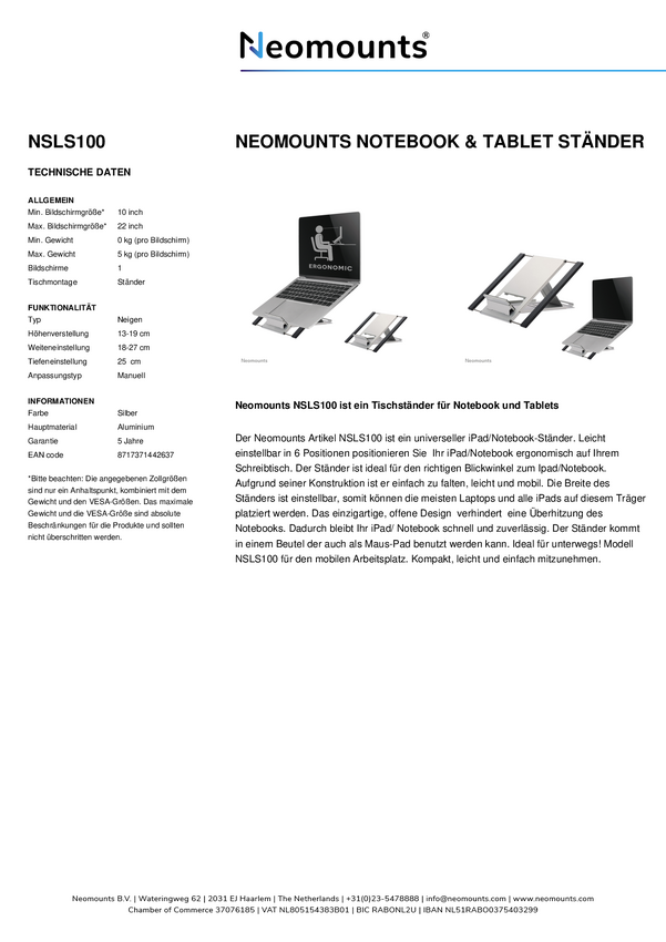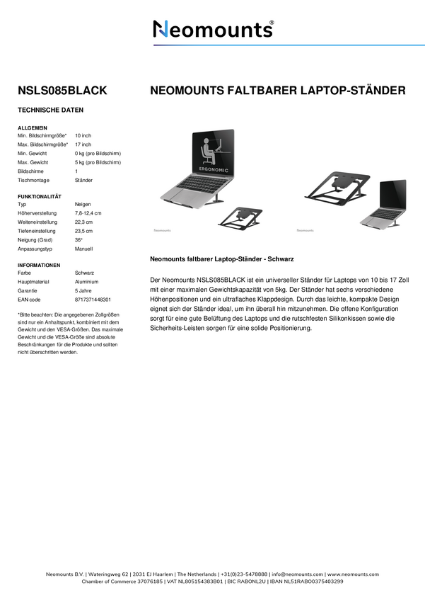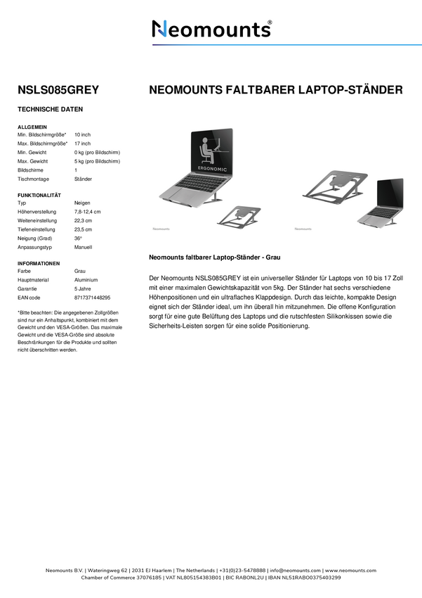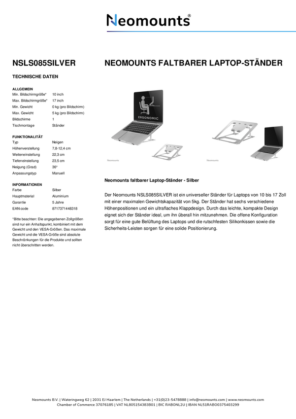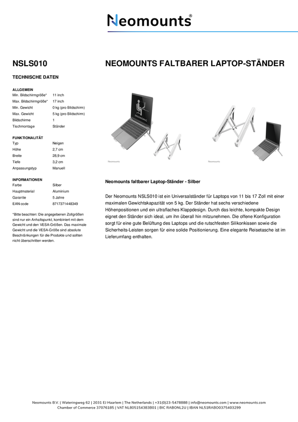 Uchwyt na laptopa Neomounts NSLS010 - 11-17" - maks. 5 kg - 6 pozycji wysokości - składany - kompaktowy - uniwersalny -