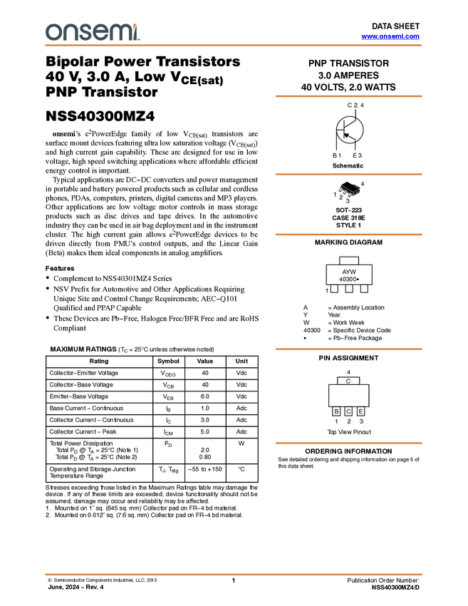 Low VCE(sat) Transistor, PNP, 40 V, 3.0 A