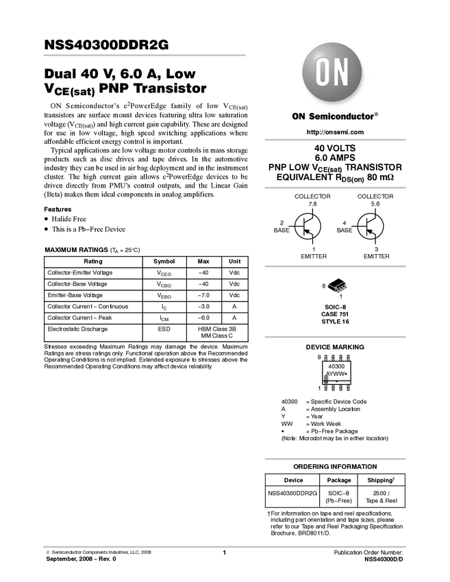 Low VCE(sat) Transistor, Dual PNP, 40 V, 3.0 A