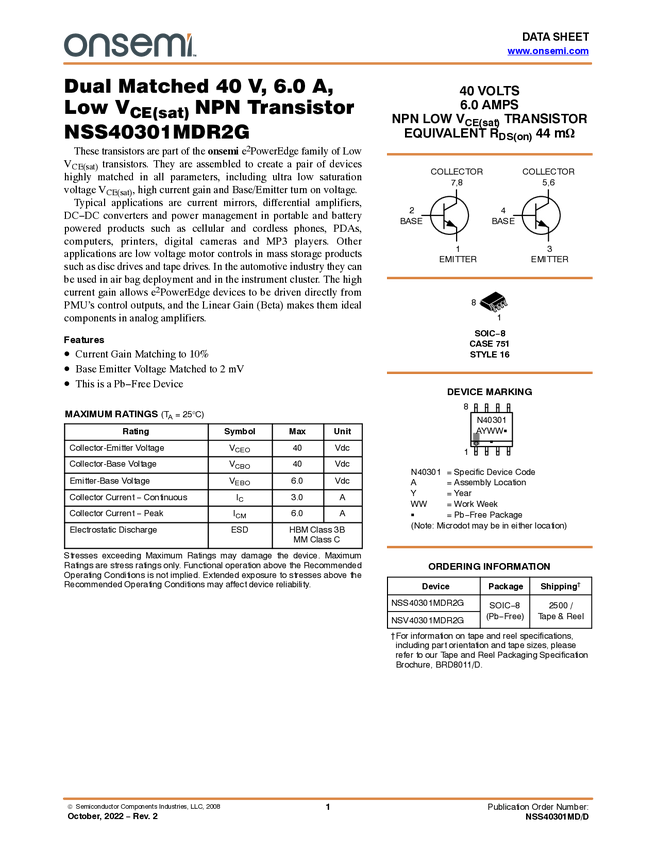 Low VCE(sat) Transistor, Dual NPN, 40 V, 6.0 A