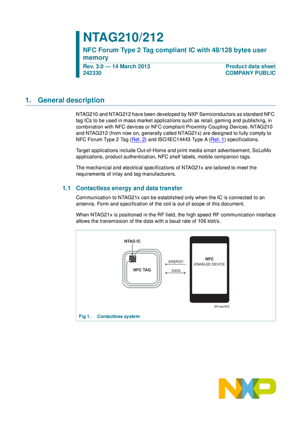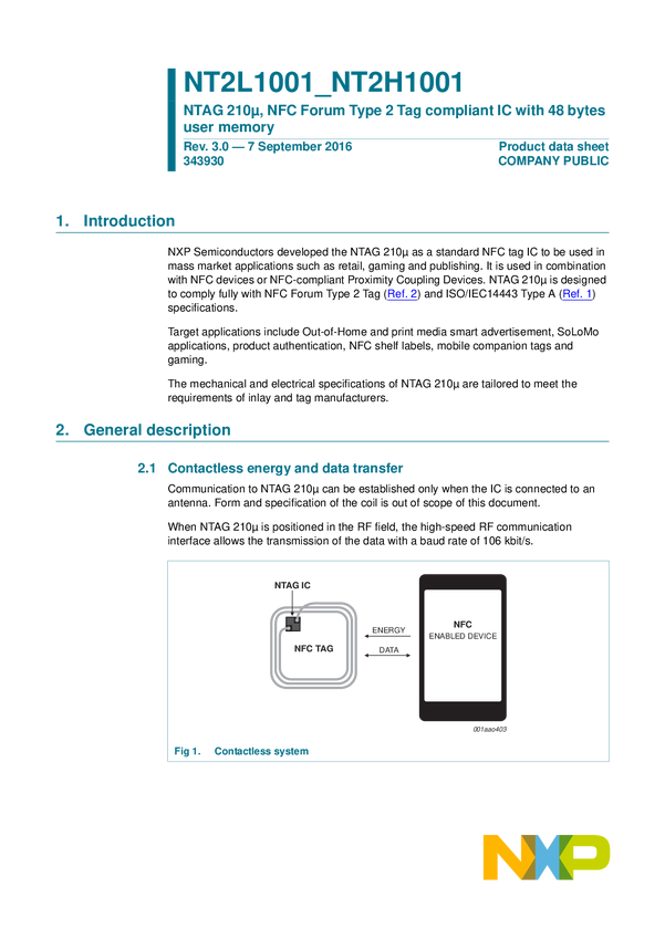 NTAG210, NFC Forum Type 2 Tag compliant IC with 48 bytes user memory