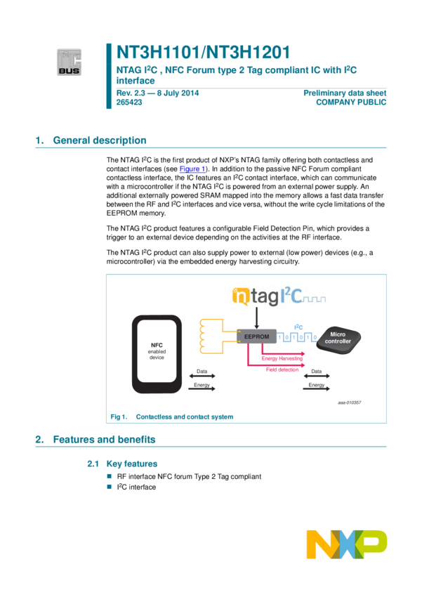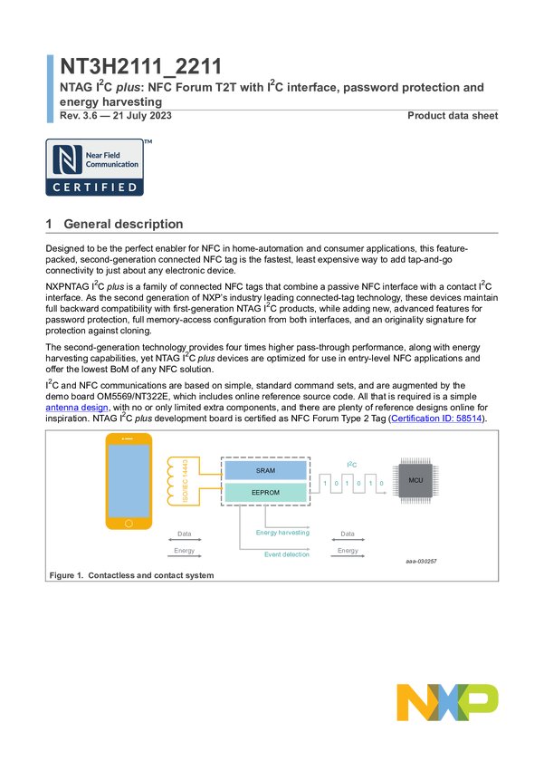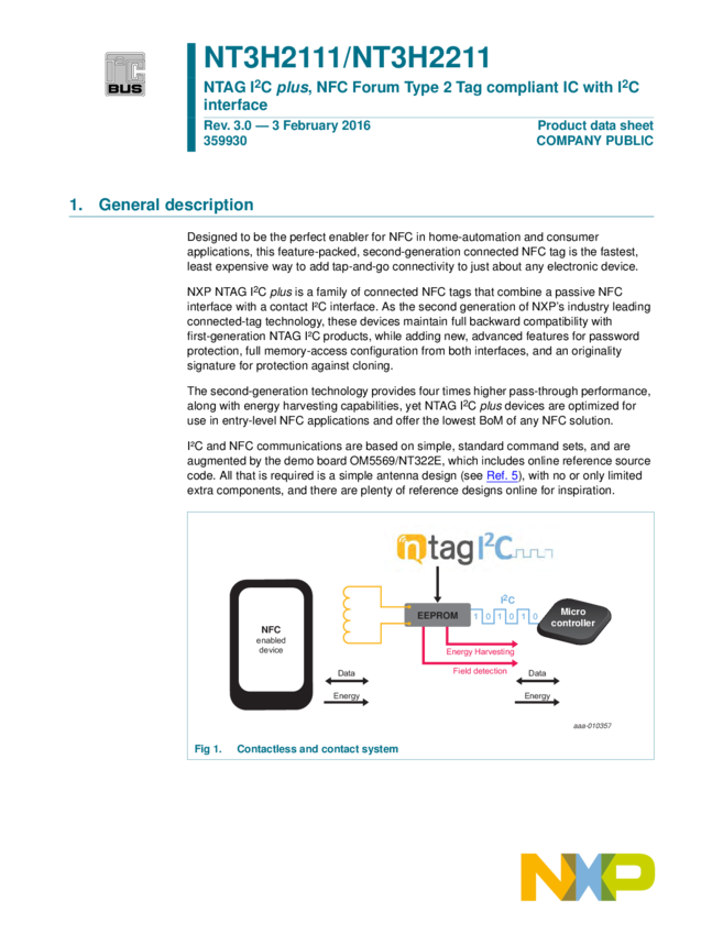 NTAG I²C <i>plus</i> 2K, NFC Forum Type 2 Tag with I²C interface optimized for entry-level NFC applications