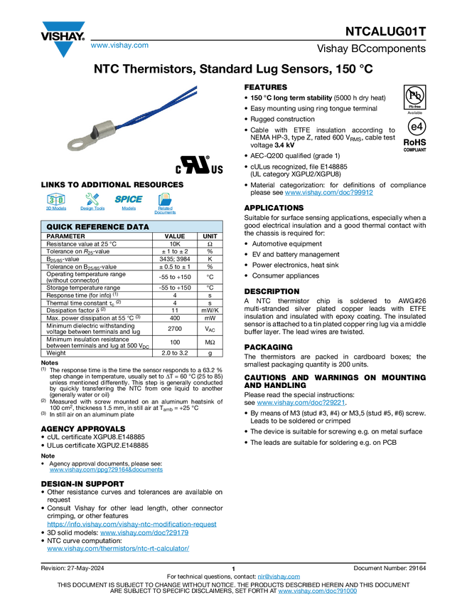 NTC Thermistors, Standard Lug Sensors, 150 °C