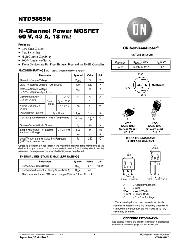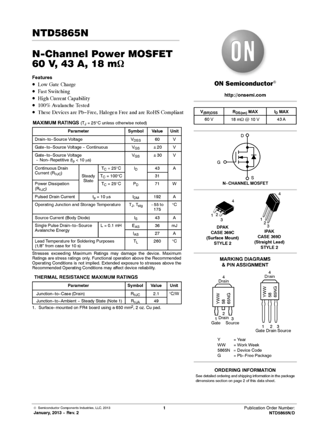 Power MOSFET 60V 43A 18 mOhm Single N-Channel DPAK