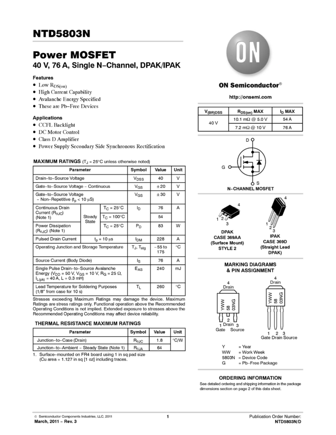 Single N-Channel Power MOSFET 60V, 98A, 5.7mΩ