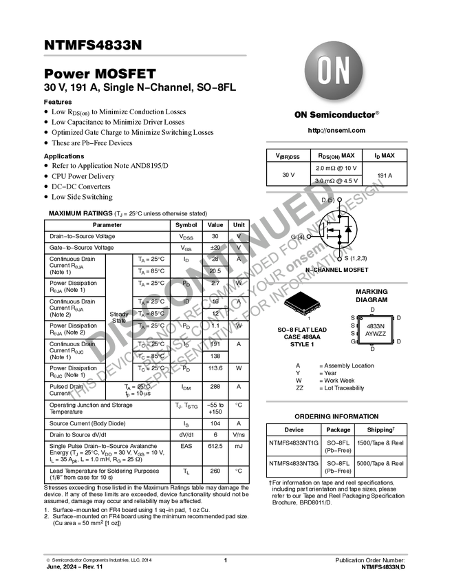 Power MOSFET 30V 191A 2 mOhm Single N-Channel SO-8FL