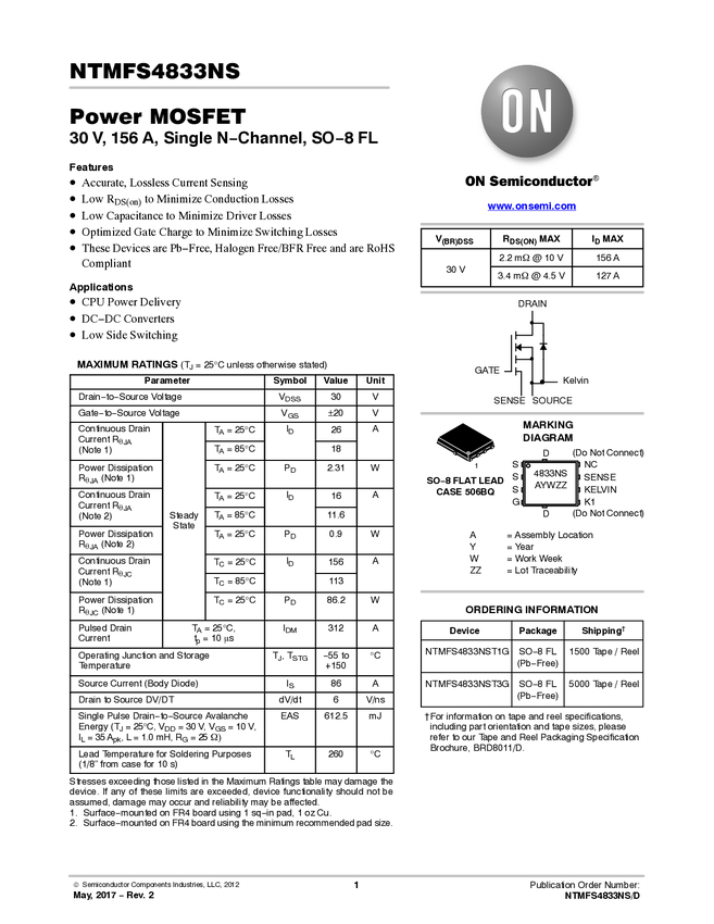Power MOSFET, Single, N-Channel, 30 V, 156 A, SO-8FL