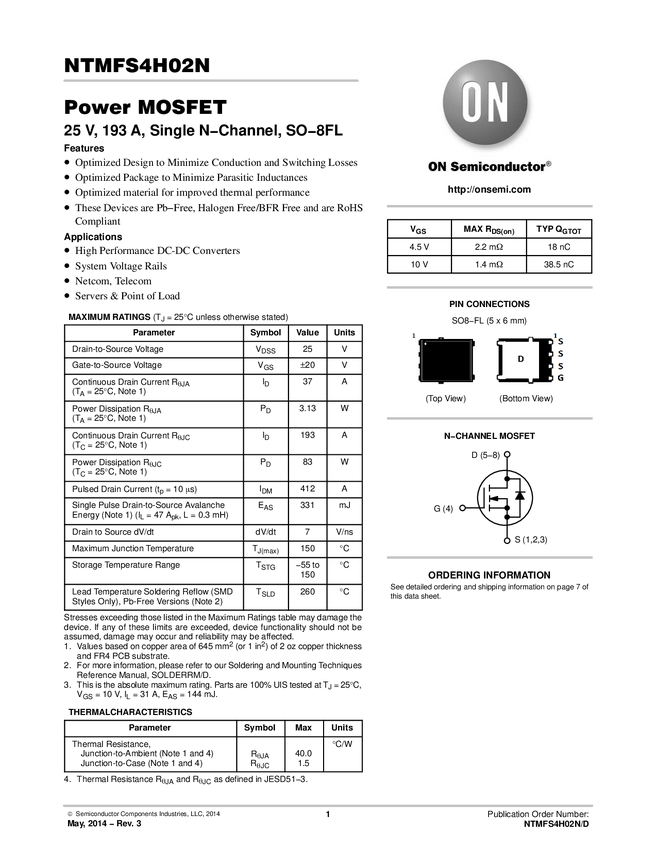 Single N−Channel Power MOSFET 25V, 193A, 1.4mΩ