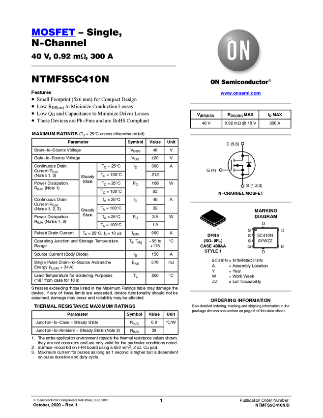 Single N-Channel Power MOSFET 40V, 300A, 0.92mΩ