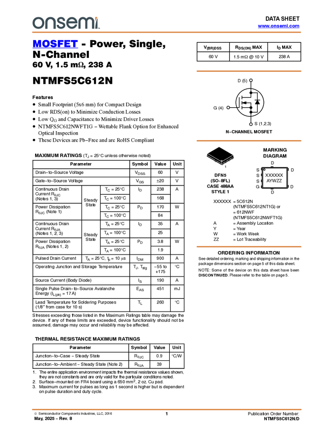 Single N−Channel Power MOSFET 60V, 196A, 1.5mΩ