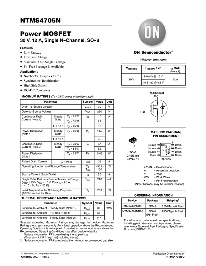 Power MOSFET 30 V, 12 A, Single N-Channel SO-8 - for new designs use (NTMS4801N or NTMS4816N)