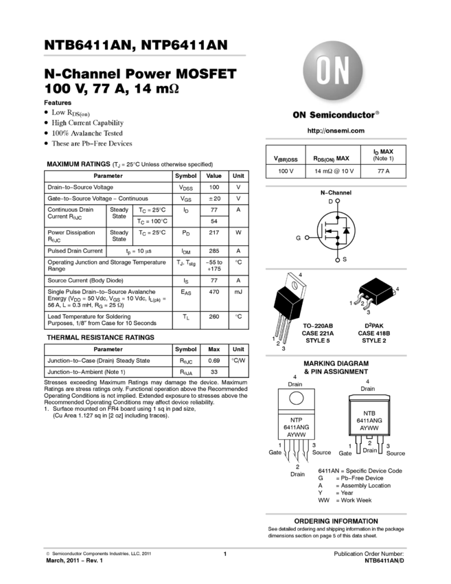 Power MOSFET 100V 77A 14 mOhm Single N-Channel TO-220