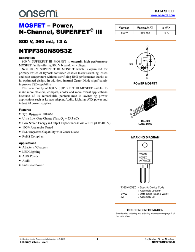 <sup>MOSFET – Power, N-Channel, SUPERFET<sup>® III, 800 V, 13 A, 360 mΩ, TO-220F