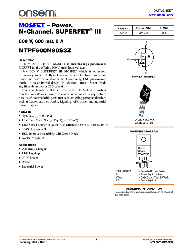 MOSFET – Power, N-Channel, SUPERFET® III, 800 V, 8 A, 600 mΩ, TO-220F