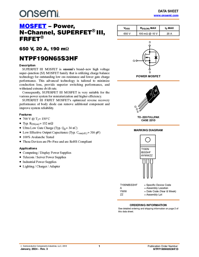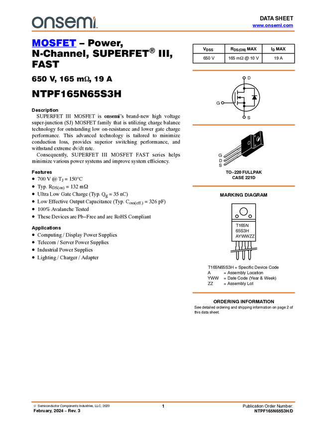 Power MOSFET, N-Channel, SUPERFET® III, FAST, 650 V, 19 A, 165 mΩ, TO-220F
