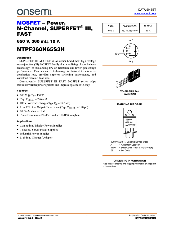 Power MOSFET, N-Channel, SUPERFET® III, FAST, 650 V, 10 A, 360 mΩ, TO220F