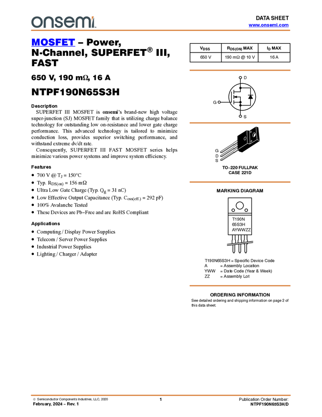 Power MOSFET, N-Channel, SUPERFET® III, FAST, 650 V, 16 A, 190 mΩ, TO220F