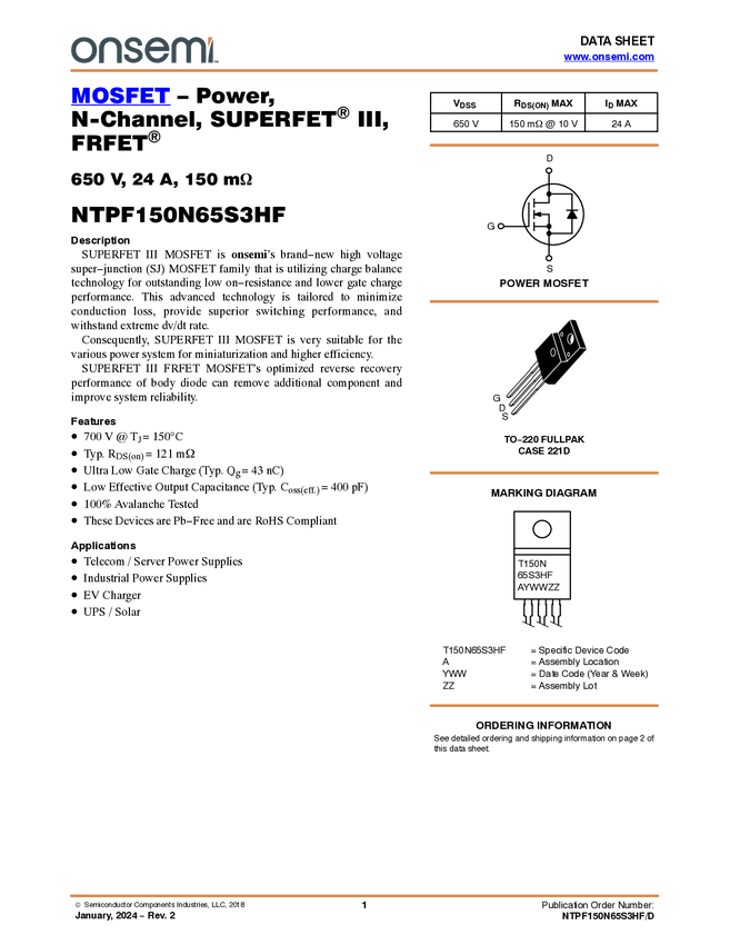 Power MOSFET, N-Channel, SUPERFET<sup>® III, FRFET<sup>®, 650 V, 24 A, 150 mΩ, TO-220F