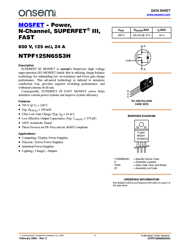 Power MOSFET, N-Channel, SUPERFET® III, FAST, 650 V, 24 A, 125 mΩ, TO-220F