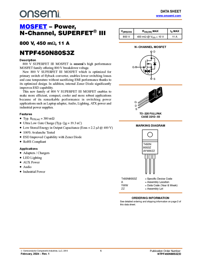 <sup>MOSFET – Power, N-Channel, SUPERFET<sup>® III, 800 V, 11 A, 450 mΩ, TO-220F