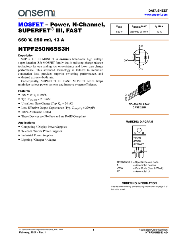 Power MOSFET, N-Channel, SUPERFET® III, FAST, 650 V, 13 A, 250 mΩ, TO220F