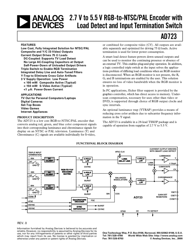 2.7 V to 5.5 V RGB-to-NTSC/PAL Encoder with Load Detect and Input Termination Switch