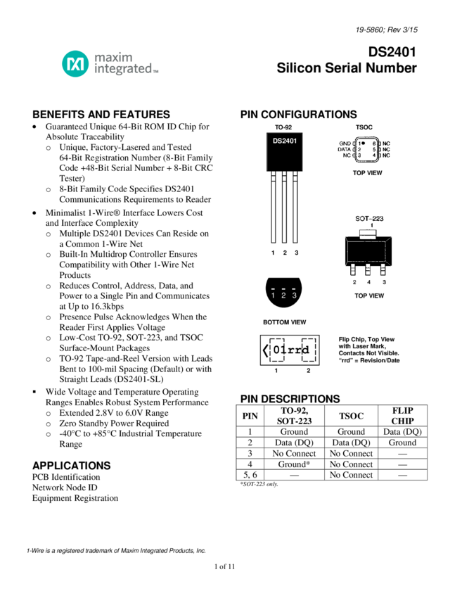 1Kb Single-Wire Serial EEPROM with a 64-bit serial number