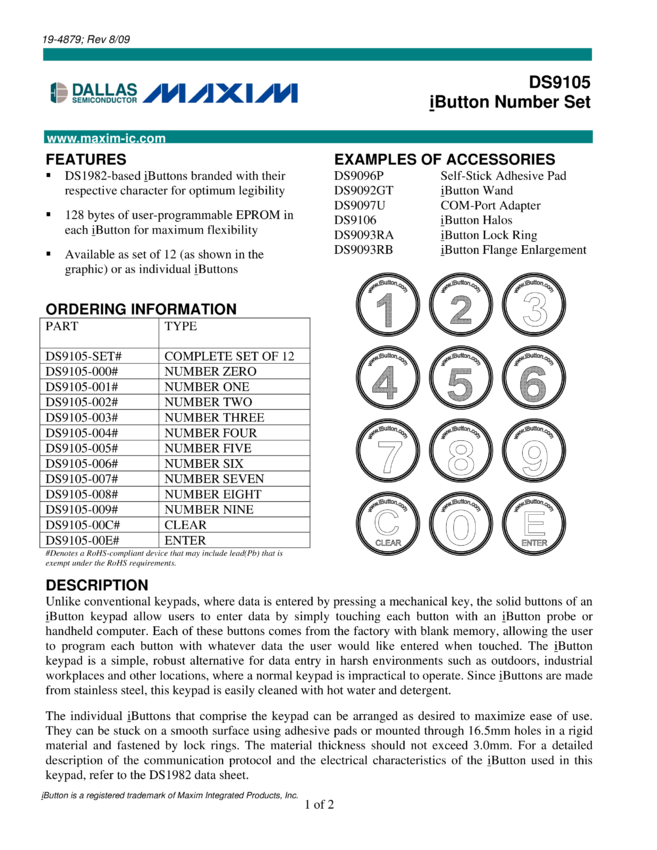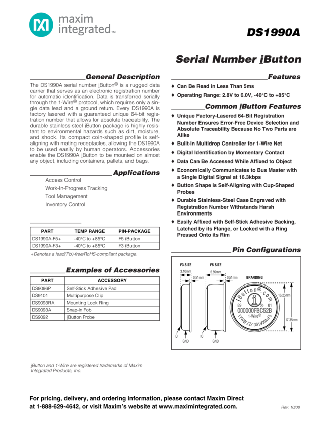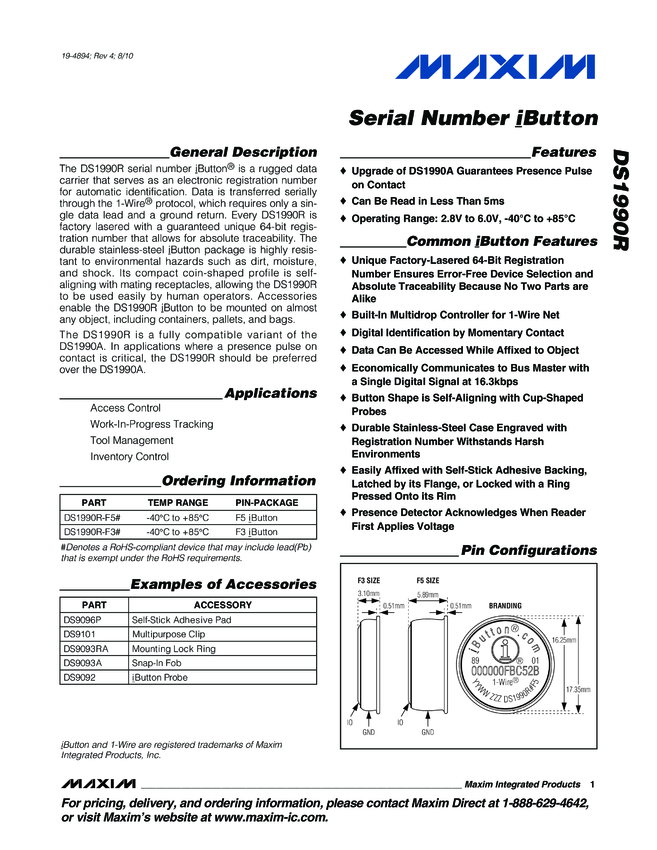 DS1990R, DS1990R-F3, DS1990R-F5 Serial Number iButton