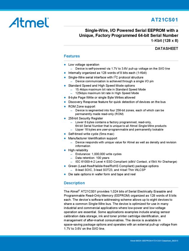 8Kb I²C-compatible 2-wire Serial EEPROM with 128-bit serial number and permanently lockable, extended EEPROM region