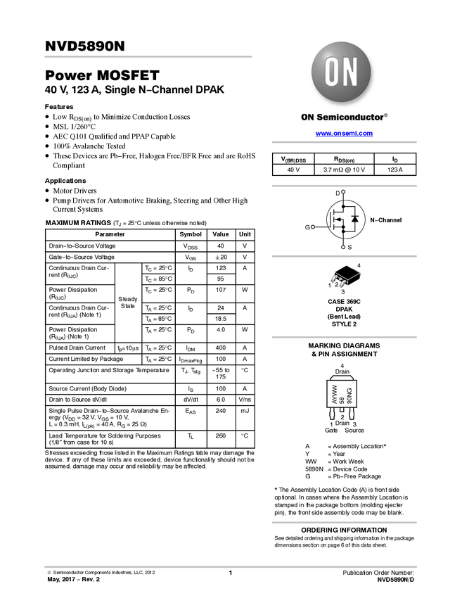 Power MOSFET 40V, 123A, 3.7 mOhm, Single N Channel, DPAK.