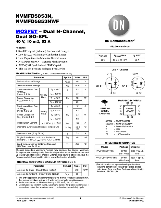 Power MOSFET 40V 53A 10 mOhm Dual N−Channel SO-8FL
