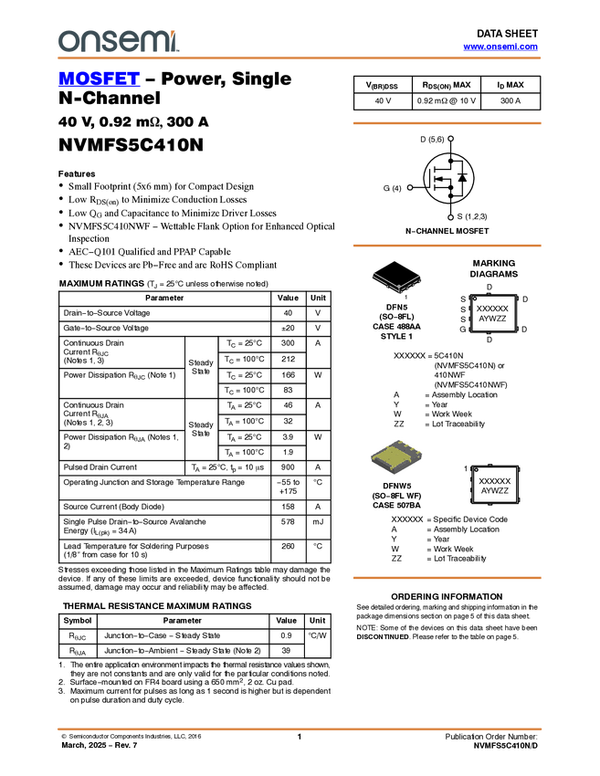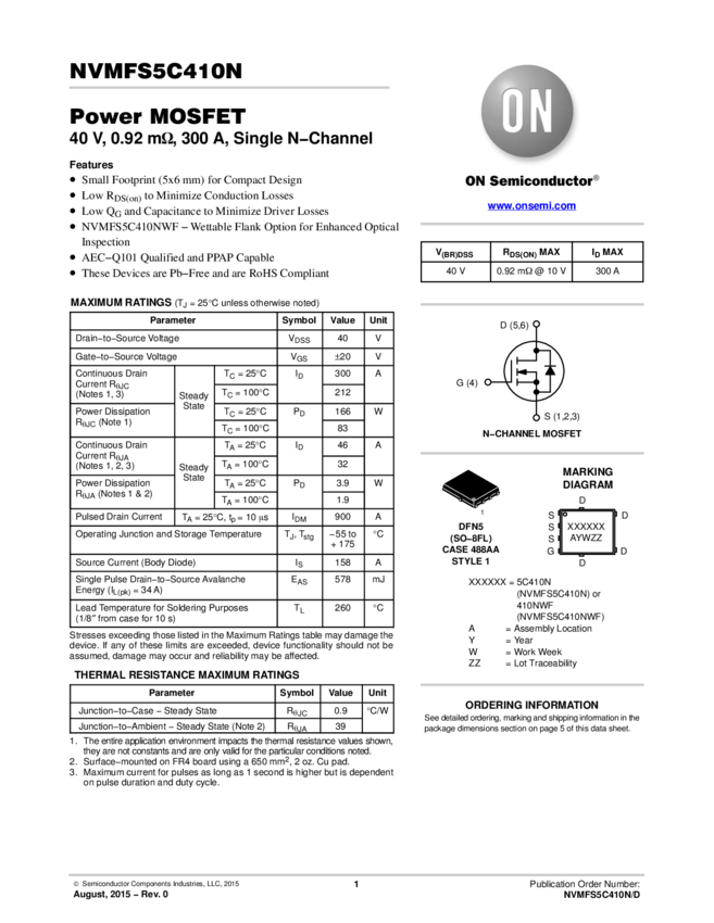 Power MOSFET 40V, 300A, 0.92 mOhm, Single N-Channel, SO8-FL.